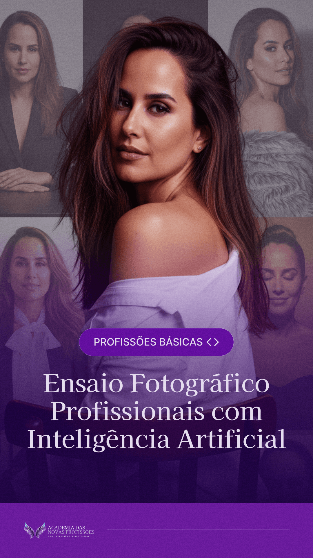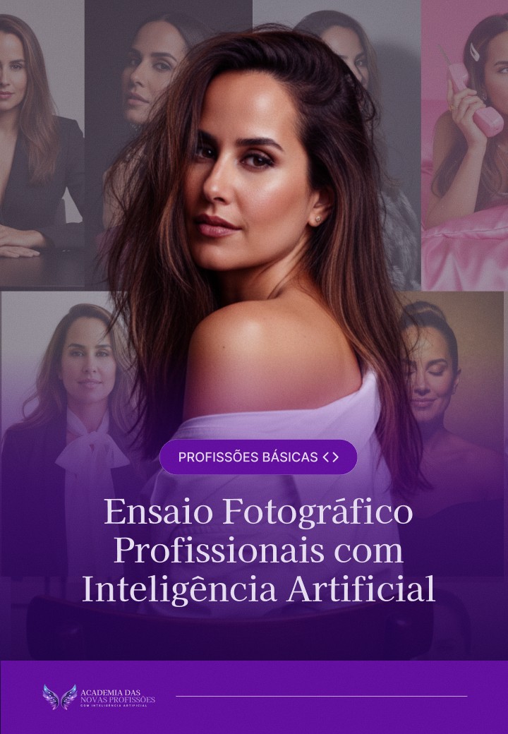 Crie ensaios fotográficos profissionais para profissionais liberais, criadores de conteúdo e consultores. Domine estilos visuais, iluminação e poses — e entregue fotos de autoridade usando Inteligência Artificial.
